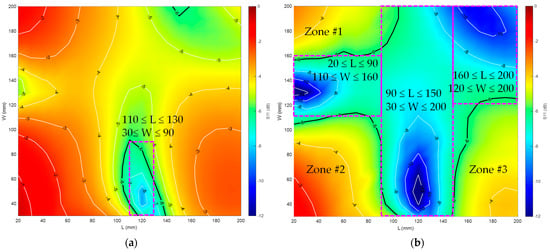 The worst reflection coefficient within the 863–928 MHz range is stored for each ground plane and then represented in a 2D plot. These results have been displayed in a thermal graph, where the warmer colours mean poor matching, and the cooler ones mean better matching (S11 ≤ −6 dB). Moreover, the edge with S11 = −6 dB is defined using a black line (Figure 4). The ground planes providing an S11 ≤ −6 dB within 863–928 MHz are within the area inside the contours defined in Figure 4, called the cluster.
