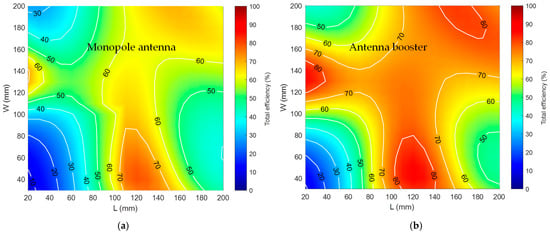 Simulated total efficiency considering the losses on the PCB (copper conductor and FR4 substrate), the losses of the matching network due to the lumped components with finite Q and the radiation efficiency as a function of the ground plane size L × W. (a) monopole; (b) antenna booster.