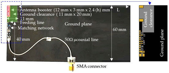 The prototype includes the 12 mm × 3 mm × 2.4 (h) mm antenna booster with a 20 mm × 11 mm ground clearance, the Lseries-Lshunt matching network, a ground plane with L × 60 mm, and an extension of 40 mm × 11 mm. In this case, L = 120 mm. The ground plane is printed on an FR4 substrate (1 mm thick, εr = 4.15, tanδ = 0.017. PCB is 131 mm × 60 mm.