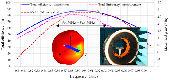 Moreover, the total antenna efficiency (ηt) of the simulated and measured antenna is also displayed in Figure 8, showing good agreement. The simulated total efficiency across 863–928 MHz is 84%, while the measured is 76%, representing a 0.4 dB discrepancy, which is tolerable. Total efficiency is measured in the anechoic chamber using 3D pattern integration with MVG StarLab 18. Regarding realised gain, it reaches 2.8 dBi at 900 MHz, showing an omnidirectional pattern at XZ (φ = 0° plane) and a drop along the long axis of the ground plane (±y direction). The radiation pattern is similar to a half-wavelength dipole, which is a consequence of the currents on the ground plane, which are aligned along the Y-axis for this ground plane size. This radiation pattern is convenient for IoT devices since the device receives almost equally from any direction of the incoming electromagnetic signal.