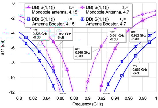The antenna booster is also more robust to variations of the permittivity of the substrate due to different FR4s or changes in humidity or temperature affecting the permittivity. In this regard, when the relative permittivity changes from 4.15 to 4.7, the S11 response for the monopole antenna shifts 2.3% to lower frequencies, whereas the antenna booster is only 1.3%.