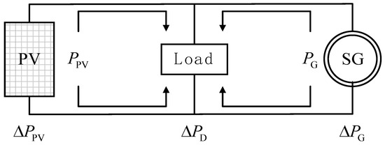 As shown in Figure 1, a microgrid containing PV units can be simplified to a simple system consisting of only a PV system, a synchronous generator, and a load. It is worth mentioning that to accurately simulate frequency deviation caused by power imbalance in the microgrid, the idealized power grid initially connected to the PV system should be replaced with an equivalent load and a synchronous generator (SG) with limited capacity. The power transmitted by the PV system and the SG to the load is and respectively, and the power on the load is . Ignoring the network loss, the following relationship can be obtained: