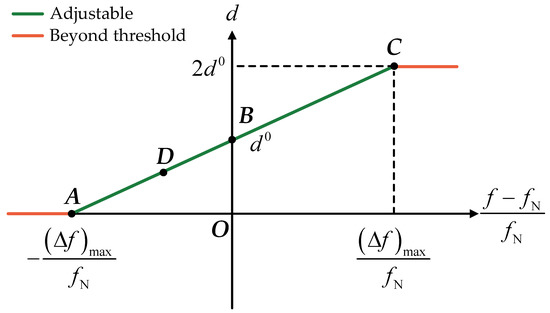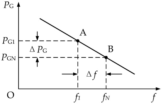 SGs will spontaneously participate in FR, and the output power will respond to changes in frequency [25]. The power–frequency static characteristic curve is shown in Figure 2, where and refer to the standard frequency of the grid and the rated power of the SG, respectively. The relationship between the frequency deviation and the output power change is shown in Equation (3).