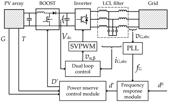 This study focuses on a two-stage three-phase PV system and proposes a frequency regulation strategy, as shown in Figure 3. The strategy employs a new “frequency loop” composed of a frequency response system, power reserve control system, and BOOST converter. This loop, along with a dual-loop control system consisting of a “voltage loop” to maintain bus voltage stability and a “current loop” to maintain voltage and current in phase, creates a control system that enables the participation of PV systems in microgrid frequency regulation.