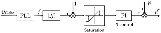 P control is differential control, while PI control is zero differential control. If only P control is used here to achieve power reserve, although the frequency deviation will be greatly reduced, it still cannot bring the grid frequency back to the standard power frequency, so PI control should be used for adjustment. The control method shown in Figure 5 coordinates the application of PLL, which samples the frequency of the grid, a saturation module, which sets the threshold value of frequency deviation within the adjustable range, as well as PI control. Use the frequency of the collected grid-side voltage to calculate the target value of the power reserve ratio of the PV system according to (10), so as to perform the remaining power reserve control. The parameters of PI control in the frequency response module are set as follows: and .