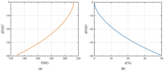 To ensure operational stability, PV systems are typically controlled to operate on the section of the P-V curve located on the right side of the MPP. It can be proved that the P-V curve on the right side of MPP monotonically decreases, and the derivative of P with respect to V also exhibits monotonicity for P. Therefore, each P value on the right side of MPP corresponds to a unique value of , as depicted in Figure 6a. Equation (7) reveals that there is a linear relationship between the output power P and the power reserve ratio of the PV system. As a result, the derivative of P with respect to V must also have a one-to-one correspondence with the power reserve ratio , as illustrated in Figure 6b, which is under the standard test condition (STC, ).