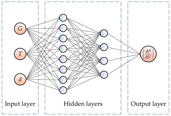 When changes occur in the external environment of the PV system, such as variations in irradiance intensity and cell temperature, the expression of the function is also affected. The generally employed approach involves combining the mathematical model of PV array and (7) and using the Newton–Raphson method to obtain the expression of through iterative process. An alternative and more efficient method is to develop a simplified PV cell model, which simplifies the mathematical model of PV array into a transcendental equation set comprising five equations and combines it with (7) to obtain the expression of . However, the former is limited by a long computational time owing to the continuous iterative solution of the transcendental equation, whereas the latter has a reduced computational accuracy, and even though it has improved computational efficiency, it still requires solving equations repeatedly at every moment. Therefore, a better approach is to use existing operating data efficiently for accurate and efficient fitting. Curve fitting using the least squares method is a data-driven approach to solving functional relationships, but inappropriate functional forms can lead to insufficient fitting accuracy or overfitting due to the unknown form of the simplified fitting expression. Thus, this study employs artificial neural networks (ANN) to fit the function , which can achieve higher accuracy and computational efficiency even without knowledge of the specific expression [26].