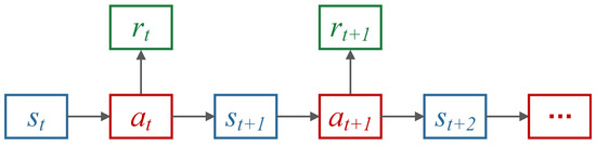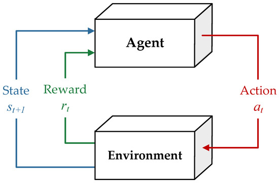The reinforcement learning framework comprises agents that can take a specific action based on the current state , as depicted in Figure 8. Once an action is chosen at time , the agent receives a scalar reward and transitions to a new state , which is dependent on both the current state and the chosen action. The policy function maps the agent’s current state to a specific action: