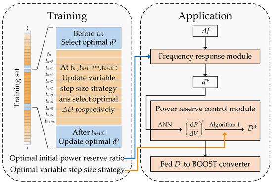 The latter category, which is more common in the literature, involves determining the operating point of the PV systems by estimating important properties of the P-V characteristic curve. In [19], a voltage offset was added directly to the voltage of MPP, denoted as , under standard test conditions (STC) to achieve a quantitative deviation from the MPP. However, this method lacks consideration of changes in external conditions, resulting in decreased accuracy when tracking the target operating point. In [20], the mathematical relation between the current of the PV array and irradiance intensity, cell temperature, and voltage of the PV array was approximated by off-line curve fitting. In [21], a simplified PV array model was utilized to estimate the P-V characteristic curve under a given external condition by substituting the value of irradiance intensity and cell temperature into the model. In [5], the parameters of a quadratic curve were estimated by employing the least squares method on a substantial number of measurement samples collected around a set of operating points, resulting in enhanced robustness of the approach in the presence of noise. However, the nonlinearity and susceptibility to external environmental influences of the PV characteristic curve limit the accuracy of the methods proposed by these three studies when tracking target operating points, which compromises the frequency support ability of PV systems. Additionally, more precise methods are being researched and developed. One such method proposed in [22] involved iteratively solving the single-diode mathematical model of the PV array using the Newton–Raphson method to obtain information near the current operating point, allowing for determination of the necessary adjustment direction of the operating point. However, this iterative solution is computationally intensive and time-consuming, rendering it difficult to provide timely frequency support during severe fluctuations in the microgrid. Another method proposed in [10] estimated the target voltage offset from through iterative calculation, while a variable-step strategy gradually moved the PV operating point to the target. However, the convergence speed of this approach needs improvement, and some key parameters were determined through manual experience, such as the initial power reserve ratio, which hindered the maximization of the balance between the frequency support ability of PV systems and the utilization rate of solar energy. In summary, the methods belonging to the second category overcome the harsh application conditions of the first category and avoid the risk of operational instability, but they also face new challenges in balancing tracking accuracy and computational speed.
