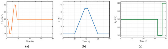 As discussed in Section 3.2, the conventional approach of determining the duty cycle step size for the power reserve control strategy has notable limitations. The variable step-size method proposed by [10] takes into consideration both convergence speed and stability accuracy, making it a better alternative to the fixed step-size method. However, whether it involves selecting a disturbance step size from a set of available step sizes or introducing a scaling coefficient to compress the step size, these methods have shown satisfactory results in MPPT algorithms but still have significant room for improvement when dealing with FR scenarios with external environmental and load fluctuations. Therefore, this case study aims to compare the frequency stabilization effects of three control strategies under various external disturbance conditions in the microgrid: MPPT control, power reserve control based on the variable step-size algorithm proposed by [10], and power reserve control using the variable step-size strategy proposed in this paper.
