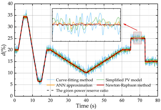 Table 1 shows that the performance of the ANN approximation method surpassed the power reserve control methods tested to different degrees, considering both the accuracy and speed of tracking a given . Therefore, in the subsequent simulations, the ANN approximation method was used in the power reserve control module.