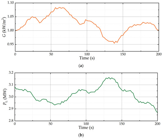 In this case, the irradiance intensity curve and load power curve were provided with a random fluctuation, as depicted in Figure 14, while the cell temperature was maintained at 25 °C. The allowed maximum frequency deviation was .