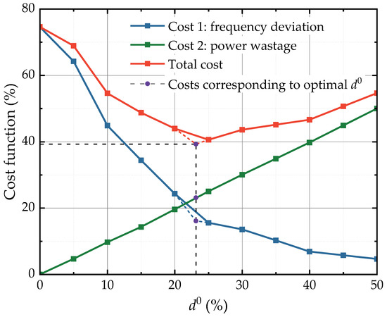 In the first step, we simulated the selection of initial power reserve ratio using manual experience. The value of the initial power reserve ratio was varied from 0% to 50% in 5% intervals. The cost of frequency deviation and power waste were calculated based on simulated operating data for each value of . The costs were then added to obtain a cost function value for a limited number of power reserve ratios. The cost function value is shown in Figure 15. The optimal initial power reserve ratio was determined to be 25%, with the corresponding frequency deviation cost, power waste cost, and total cost being 15.56%, 24.98%, and 40.62%, respectively.