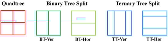 - Park, S.-h.; Kang, J.W. Context-based ternary tree decision method in versatile video coding for fast intra-coding. IEEE Access 2019, 7, 172597–172605. [Google Scholar] [CrossRef]