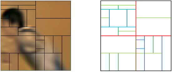 Fu et al. [10] decided to terminate the vertical splits and TT horizontal split early based on the information of the two sub-CUs after the BT horizontal split. Park and Kang [11] determined the TT split direction of the current CU based on the Bayesian approach by comparing the rate-distortion costs (RD costs) of the horizontal and vertical splits of the BT split. If the RD cost of the horizontal direction is greater than or equal to the RD cost in the vertical direction, the horizontal direction split will be skipped during the TT split; otherwise, if the RD cost in the vertical direction is greater than or equal to the RD cost in the horizontal direction, then the TT vertical split will be skipped. Zhang et al. [12] employed the Bayesian principle to make the CU splitting decision, and utilized the improved de-blocking filter to determine the CU splitting mode.