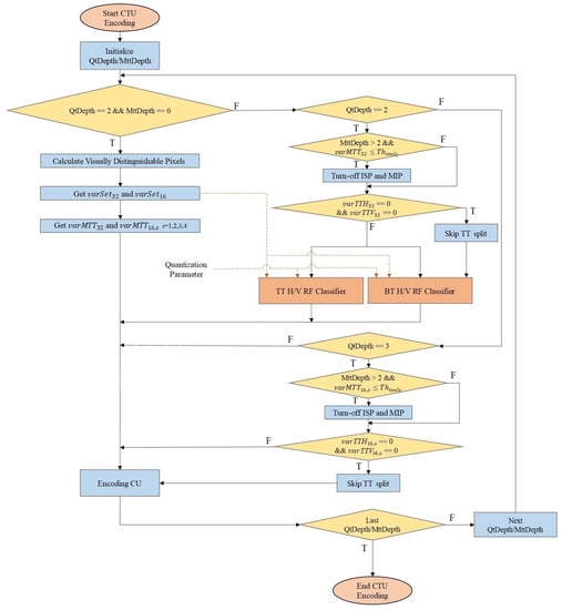 The overall algorithm in this paper mainly consists of two strategies based on visual perception information. The first strategy is the fast algorithm for turning off the ISP and MIP intra picture prediction tools, based on the condition decided by the variance when the QtDepth is 2 or 3 and the MttDepth of CU is larger than 2. The second strategy is to use the information of visual perception and QP to propose horizontal/vertical split models trained by the random forest classifiers of machine learning, to select the splitting direction for BT and TT individually when the QtDepth is 2. In addition, if both and , calculated by (6) and (7), are 0 for the case of 32 × 32 CU (QtDepth 2) or 16 × 16 CU (QtDepth 3), the subsequent TT splits are terminated in the corresponding QtDepth. The flowchart of the overall algorithm is shown in Figure 5.