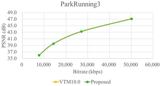 RD curve comparison between the proposed algorithm and VTM10.0 for Class A2 Parkrunning3 sequence.
