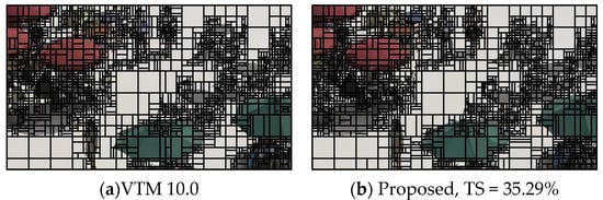 Figure 6 compares the rate-distortion curve (RD curve) between the proposed algorithm and VTM10.0 for Class A2 Parkrunning3 sequences. The curve of the proposed method is close to that of VTM10.0, and the TS of the proposed method reaches 59.75%. Figure 7 demonstrates the QT/MTT partition results of the frame in the class D BQSquare sequence. The partition results are similar regarding both the complex blocks and uniform blocks.
