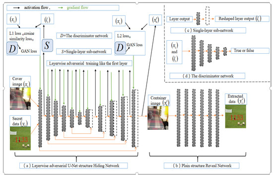 Through each single-layer sub-network, this paper obtained the reshaped outputs of each convolutional unit that should match the shape of the cover images. As shown in Figure 2a, the L1 loss and the cosine similarity loss between and is calculated first. Then, D is exploited to discriminate which of them is true. Furthermore, the GAN loss [3] between and is calculated. Finally, the L1 loss, the cosine similarity loss, and the GAN loss are utilized to handle local backpropagation and update the weights of each convolutional unit and the weights of the same discriminator. For the adversarial learning [3] between G and D of these layers, we train the proposed layer-wise adversarial process by solving a minimax optimization problem given by: