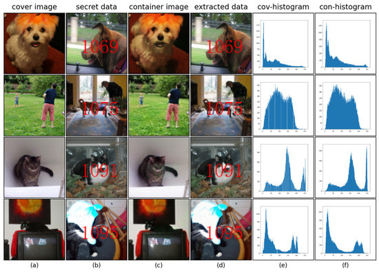 The image steganography results from two datasets. (a) cover images; (b) secret data; (c) container images; (d) extracted secret data; (e) the histogram of cover images; (f) the histogram of container images.