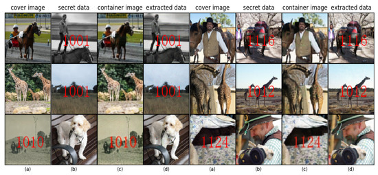 More image steganography results from horse, giraffe, and dog datasets. (a) cover images; (b) secret data; (c) container images; (d) extracted secret data.