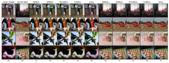 Figure 6 shows that, after removing LAL or removing CS or removing GAN, the watermark information in the secret data cannot be hidden. Therefore, it can be concluded that only the combination of LAL + L1 + GAN + CS can achieve reasonable results. The possible reason is that the combination of GAN + CS can obtain the most accurate watermark position information.