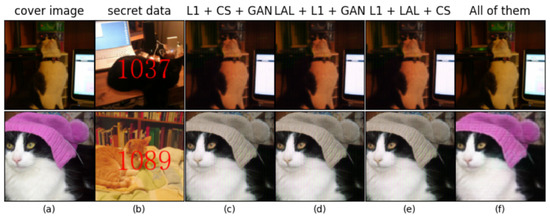 Ablation study. (a) input cover images; (b) input secret data; (c) the container images of L1 + CS + GAN; (d) the container images of LAL + L1 + GAN; (e) the container images of LAL + L1 + GAN; (f) the container images by using all of them.