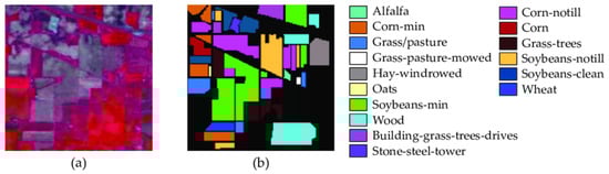 Indian Pines dataset (a) false-color composite image, (b) corresponding ground-truth image with class labels.