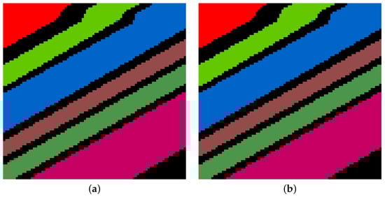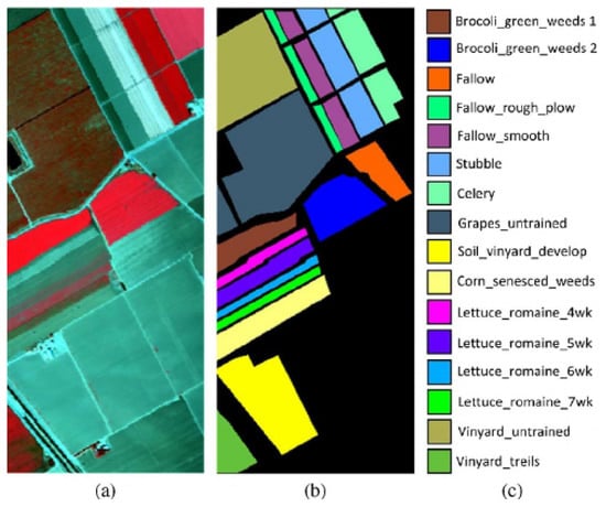 The NASA AVIRIS sensor also collects the Salinas image set at Salinas Valley, California. The Salinas image dataset also contains 224 spectral bands. The size of each band is pixels. During the preprocessing for the experiment, 20 water-contaminated bands were reduced. The Salinas dataset contains classes of 16 ground-truth objects illustrating vegetables, bare soils, and vineyard fields. The collected image has been downsampled to with 200 bands. Figure 2 illustrates the dataset with a false-color composite image and ground-truth image with the corresponding class labels.