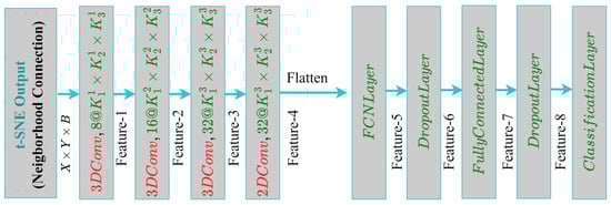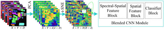Although tSNE better visualizes the data than PCA, there are still some disadvantages of tSNE; for example, it may take more time when the dataset is too large [,]. For this purpose, PCA is used for dimension reduction first, and then tSNE is applied to the reduced PCA features. Therefore, the processing time increases greatly. After that, the BlendedCNN, a deep convolutional neural network is applied to obtain a better classification accuracy, preserving both spatial–spectral relations of the HSI pixels.