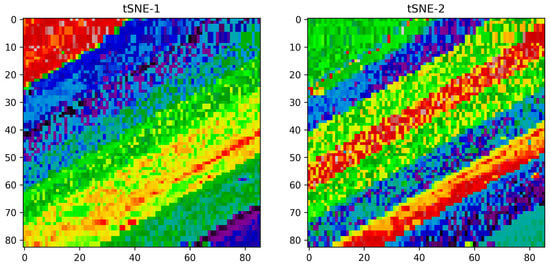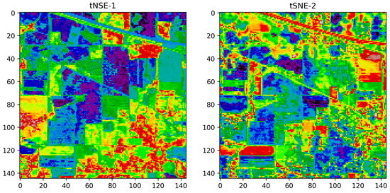 The main goal of the tSNE is to preserve the local and global relationship between pixels. This tSNE algorithm provides a better-reduced dimension and better visualizes the data for linearly inseparable class data such as in the Indian Pines images. Figure 4 and Figure 5 the two main components after the tSNE algorithm for the Indian Pines and Salinas datasets, respectively. From this output, it can be shown that it provides the maximum information, like the ground-truth reference image.