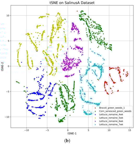 The performance comparison of the proposed model with the state-of-the-art models for the SalinasA dataset is demonstrated in Table 4. The output of the Salinas dataset after applying tSNE given on Figure 5. The Figure 7 visualizes the scatter plot of the clusters of different classes after PCA and tSNE applied. The Figure 11 illustrate the classification map or prediction of the proposed model using the SalinasA dataset. The visualization image Figure 11a,b seem to be the same because of the prediction performance near the 100%, and it showed the same as the original or ground truth images.