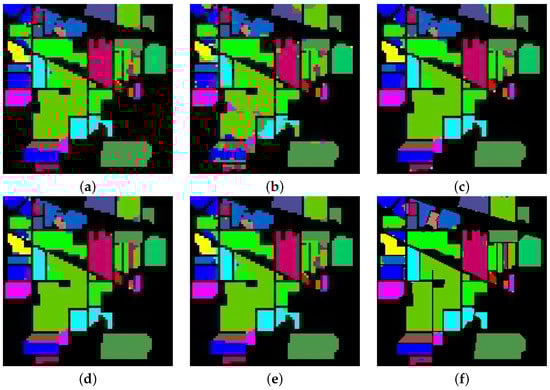 Classified images of Indian Pines dataset using (a) NMF, (b) ICA, (c) RBF and cosine, (d) Cosine and linear, (e) KPCA with cosine kernel, and (f) the proposed method.