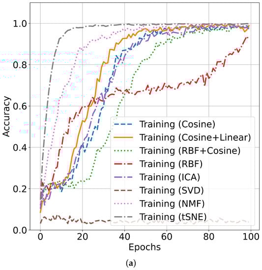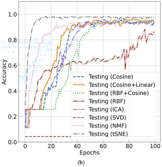 The classification accuracy performance is listed in Table 3, and it can be seen that SVD(Singular Value Decomposition) and BlendedCNN provide the least performance measures in all points of view. ICA and BlendedCNN provide moderate performance in all cases with Average Accuracy(AA). NMF and blended CNN algorithms provide of average accuracy, which is far better than SVD and ICA algorithms. Different kernels show different accuracy values compared to KPCA and MKPCA. Among them, the combination of Cosine and RBF in the kernel in MKPCA provides better average accuracy of . On the other hand, the proposed tSNE and BlendedCNN show the best performance for the studied dataset, , the highest among the studied methods. Thus, it can be concluded that tSNE with the BlendedCNN algorithm outperforms the studied baseline approaches. The tSNE algorithm provides quick saturation of the training accuracy in only 25 epochs with an accuracy of almost . NMF provides near accuracy after 70 epochs. All others, i.e., KPCA with different kernels and ICA, are almost similar. However, SVD provides the lowest training accuracy. Therefore, it is easily shown that tSNE provides the best training accuracy on this example dataset. The testing accuracies of the studied methods are presented in Figure 10, and it can be seen that the testing accuracy of the proposed method is higher than that of all the baseline methods. It provides quick saturation in the accuracy after only 20 epochs with an accuracy of almost . MKPCA with RBF and cosine kernel provides near accuracy after 95 epochs.