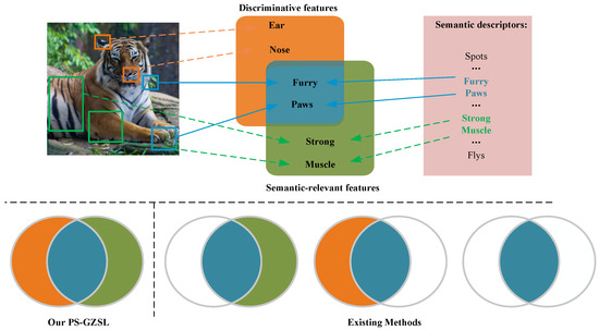 Unfortunately, existing methods tend to bypass or ignore these challenges between discriminative and semantic-relevant, resulting in passable performance on unseen classes. Specifically: (1) some researchers focus solely on semantic-relevant representations through elaborate visual-semantic alignment [8,9,10], while others concentrate on advanced discrimination techniques to extract more generalizable discriminative representations [11,12]. (2) Furthermore, the conflict between discrimination and visual-semantic alignment is often neglected, as recent methods primarily focus on learning shared representations between these two sub-task [7,13,14]. As a result, their poor generalization can be attributed to the discarding of some task-specific information between sub-tasks, which can be viewed as the “diamond in the rough” for GZSL. Some works in domain generalization (DG) have shown that this specific information could enhance a model’s generalization performance when classifying unseen classes [15,16]. For example, in the AWA1 dataset shown in Figure 1. attributes like “Strong, Big” that are not visually discriminative can still reduce the misclassification between tigers and cats. Similarly, visual cues like the ear and nose shape are salient for classifying image samples but not represented in the semantic descriptors.