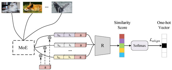 To address the aforementioned challenges and limitations, we propose a novel partially-shared representation learning network, termed PS-GZSL, which jointly preserves complementary and transferable information between discriminative and semantic-relevant features. First, to resolve the conflict between tasks and avoid information loss, PS-GZSL proposes a partially-shared multi-task learning mechanism to explicitly model both task-shared and task-specific representations. As depicted in Figure 2, PS-GZSL utilizes three Mixture-of-Experts (MoE) [17,18] to factorize a visual feature into three latent representations: a task-shared discriminative and semantic representation , a task-specific discriminative representation , and a task-specific semantic-relevant representation . Each sub-task corresponds to a task-specific and a task-shared representation. Second, to ensure the stability and expressiveness of learned representations, PS-GZSL draws inspiration from the success of contrastive learning [19] and metric learning [20], proposing two effective sub-tasks: an instance-level contrastive discrimination task and a relation-based visual-semantic alignment task. These tasks have been proven to achieve better generalization performance, respectively. To avoid representation degeneration, PS-GZSL randomly drops out experts in each MoE. Furthermore, PS-GZSL is a hybrid GZSL framework that integrates with a feature generation component. In feature generation, PS-GZSL adopts a conditional generative adversarial network [21] with a feedback mechanism to mitigate the bias towards seen classes in the latent representation space.