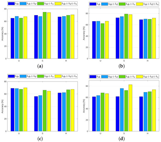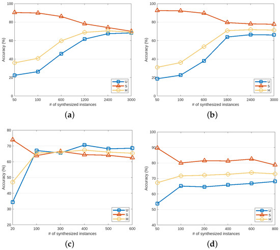 - Visualization of Different Number of Synthesized Samples. The number of synthesized samples per class was varied, as shown in Figure 9. The results show that the performance on all four datasets increased with an increasing number of synthesized examples. This demonstrated that the bias towards seen problems was relieved by the feature generation in our PS-GZSL. However, generating too many samples will impair the accuracy of seen classes () and eventually hamper the harmonic mean . Therefore, selecting an appropriate value to achieve the balance between and is important.