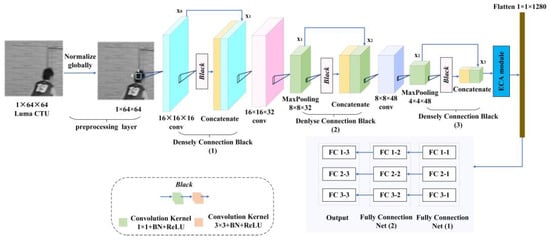 The D-CNN is mainly composed of three convolution layers, three densely connected blocks, two maximum pooling layers, an ECA module, and two fully connected networks, in which the densely connected block is composed of two convolution blocks. Without loss of generality, this paper only analyzes the luminance information of the video sequence, i.e., only the pixel blocks composed of Y components in the input 64 × 64 CTU are taken. Additionally, the global normalization preprocessing operation is carried out to make the training data more convergent. The overall structure of the proposed model framework is shown in Figure 2.