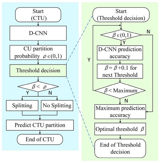 The proposed method can avoid redundant iterations when extracting the best CU depth compared with the traditional CU partition process, as shown in Figure 1. Three main decision-making processes are engaged. The first process is the design of the network framework and the selection of the corresponding parameters for the D-CNN. The second process is the design of the appropriate loss function for the D-CNN process. Additionally, the third process is the design of the optimal threshold for the CU partition results obtained from the D-CNN. For clarification, each process is discussed in detail in the following subsections.
