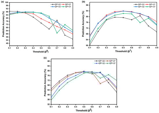 To obtain the best prediction accuracy of the CU partition, is tested using the pre-assignment method. Specifically, the CU partition probability outputs by the D-CNN are compared with the thresholds to obtain the predicted entire CTU partition. Here, is preassigned sequentially and the corresponding average prediction accuracy is calculated each time. The above procedure was repeated for three different depths, 0, 1, and 2, and the four QP values {22, 27, 32, 37}. Finally, the relationship between the corresponding threshold for depths, 0, 1, and 2, and the prediction accuracy is obtained, respectively, as shown in Figure 4a–c. It can be seen in Figure 4 that the network training accuracy fluctuates with the threshold value changes. The fluctuations are due to the fact that the threshold value causes errors in the CU partition results predicted by the network, which, thus, affects the accuracy of the CU partition prediction in the D-CNN. Therefore, the choice of the threshold value is critical. Due to the special structure of quad-trees, the impact of the CU partition at high depths on computational complexity and the RD performance may be greater. It is clear that in Figure 4, with a threshold of 0.5, the overall network training accuracy obtains greater values. Therefore, we choose the threshold that achieves the maximum prediction accuracy at high depth as the optimal threshold for this experiment.