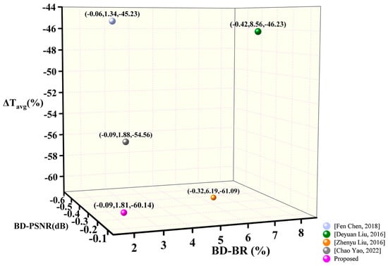 Figure 5 shows the comparison results between the proposed algorithm and the other four algorithms mentioned above in a three-dimensional visual graphical format. The three-dimensional graph can visually display the performance of various indicators of each algorithm. The meaning of (%), BD-BR(%), and BD-PSNR(dB) are as mentioned above. It is undeniable that the proposed method is in the best position when compared with the four methods [16,20,25,39] and outperforms all of the compared algorithms in terms of overall evaluation criteria. In particular, the trade-off between complexity reduction and the RD performance of the proposed method is better than that of the method with minimum bit rate performance degradation [16] and the method with maximum complexity reduction [25]. It is noteworthy that the complexity reduction and coding efficiency performance of the proposed method are both better than those of the method in [39]. Experiments on other different resolution A–E class sequences have yielded similar results, showing excellent RD performance and good prediction performance for the CU partition structure without any limitations of the proposed method.