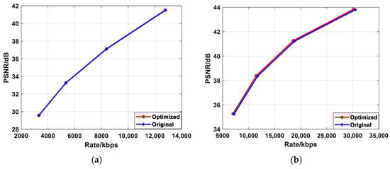 where the =, , and , respectively, are the output range of high and low bitrate RD curve. and are the RD curves corresponding to the proposed method and the original method. The smaller the increase in BD-BR and the decrease in BD-PSNR, the smaller the loss of the RD performance.