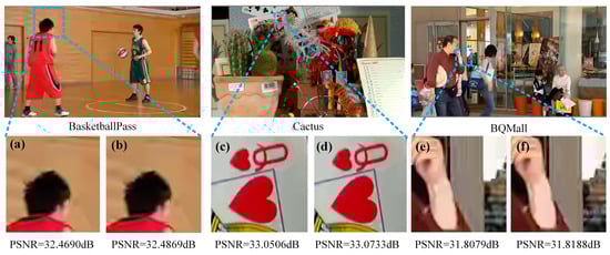 Objective (in PSNR) and subjective results (for the zoom-in areas of the first frames of BasketballPass, Cactus, and BQMall sequences with QP = 37, respectively) obtained by the (b,d,f) original HEVC frame coding (PSNR = 32.4869 dB, 33.0733 dB, and 31.8188 dB); the (a,c,e) proposed CNN-based framework (PSNR = 32.4690 dB, 33.0506 dB, and 31.8079 dB).
