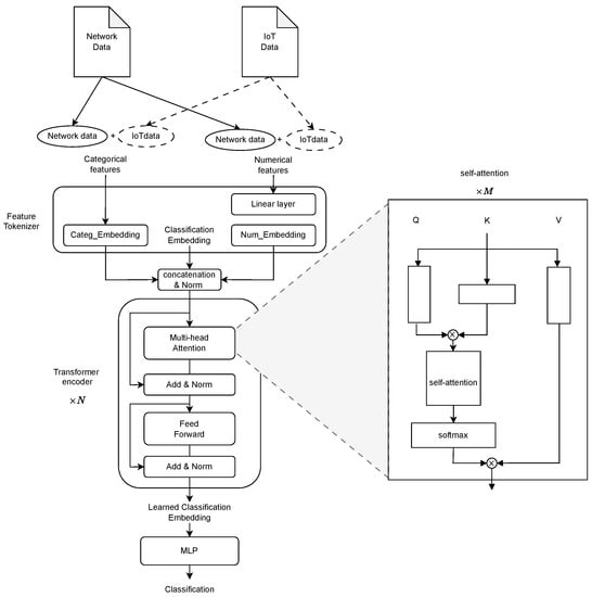 Feature Tokenizer. The Feature Tokenizer module is responsible for transforming the input feature values into learnable embeddings. Specifically, the Feature Tokenizer module takes categorical features and numerical features as two parts of input ( and ) separately. Each part can include network data only or a combination of network and IoT data. The categorical features and numerical features are embedded in different ways, which are explained as Equations (1) and (2) in detail, where and are the weights of the numerical embedding layer and bias, and and are the categorical embedding function and bias.