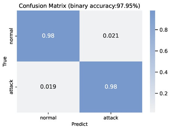 Figure 4 shows the binary classification performance by using a confusion matrix, which performs a total accuracy of 97.95%; both true positive and true negative are around 98%, the false positive is 2.1%, and the false negative is 1.9%. More evaluation results for the binary classification on network data are shown in the FT-Transformer1 column in Table 3, particularly the F1 score is 97.09% and the AUC score is 99.82%.