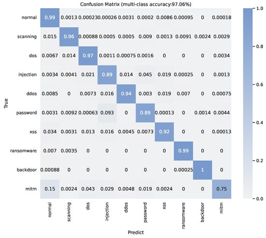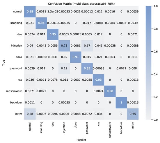 The multiple classification performance on pure network data is shown in Figure 5 and Table 1; our method can achieve 95.78% overall accuracy. Based on the result in Figure 5, we observe that the three attacks with the worst detection accuracy are “mitm (Man In The Middle)”, “injection”, and “password” attacks with accuracies of around 65%, 73%, and 85%, respectively. The confusion matrix presents that the poor performance of “injection” and “password” are caused by the difficulty in distinguishing them from each other. Around 28% of “mitm” attacks are classified in normal traffic.