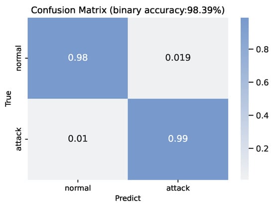 The binary classification performance on the combination of network and IoT data is shown as the confusion matrix in Figure 6. With the extra IoT sensor data, our method achieves 98.39% binary accuracy, which increases by 0.44% compared with pure network data performance. The true positive is around 99% and the true negative is around 98%, the false positive is 1.9% and the false negative is 1.0%. More evaluation results for binary classification on the combined data are shown in the FT-Transformer2 column of Table 3. Specifically, the F1 score is 97.72% and the AUC score is 99.88%.