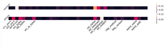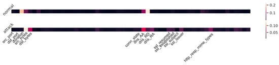 The attention-based feature importance figures on pure network data and the combination of network and IoT data are shown in Figure 8 and Figure 9 separately. In Figure 8, the horizontal axis represents all input features of network data, and the vertical axis is a different type of flow. For normal and attack flow, a one-dimension heat map of attention weights is used to show the contribution of each feature. Based on the lightest parts, we notice that the “duration” makes the most contribution to identifying a normal flow and the “ssl_established” feature is the most important one for attack flow. Similarly, Figure 9 shows the attention-based feature importance for all features from both network and IoT sensor data. Comparing these two figures, we find that the “duration” is always a light region for both images. Additionally, “src_bytes” and “dst_bytes” are important to detect an attack for both situations. However, the “ssl_established” feature, which has a large attention weight in Figure 8, becomes less contributed in Figure 9. Therefore, we claim that the attention weights have limited interpretability and further study and more experiments are required. Interpretability is important for ML-based NIDS for the reason that users need to understand why the decision was made.