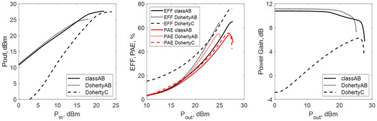(left), efficiency and PAE (middle) and power gain (right) for the three cases: classAB, DohertyAB and DohertyC.