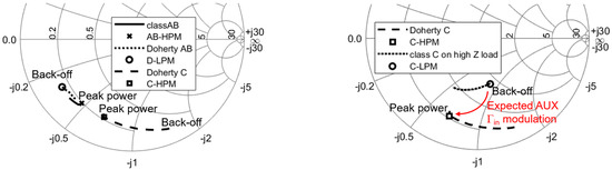 Left: Input reflection coefficient for the three cases: classAB, DohertyAB and DohertyC. AB-HPM (class AB–High-Power Match) matches the input port of the class AB at peak power. D-LPM matches the DohertyAB amplifier in back-off and C-HPM matches the input port of the DohertyC at peak power. Right: Class C input reflection coefficient of the DohertyC (dashed line) compared to a class C stage loaded with high impedance (equivalent to —dotted line). Red arrow: expected modulation of the AUX amplifier input reflection coefficient in the Doherty amplifier.